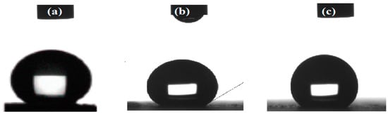 Contact angles of water on HSNP-2 surfaces (HSNP-2 samples were prepared with different contents of ASAS (a) 40, (b) 10, and (c) 5 wt.% at 25 °C).