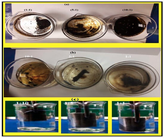 Images showing oil spill collection with (a) superhydrophobic sand, (b) HSNP-2 (prepared in the presence of 40 wt.% ASAS), and (c) PU sponge treated with HSNP-2 (prepared in the presence of 40 wt.% ASAS).