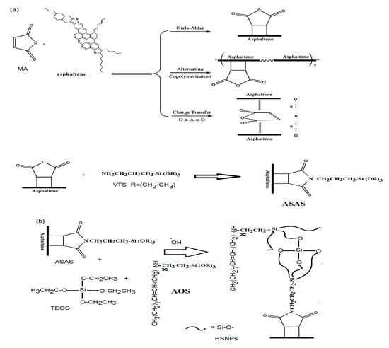 In this article, we report the formation of ASAS via the formation of asphaltene-maleic anhydride adducts followed by the reaction with APS, as represented in Scheme 1a. Similarly, HSNP-2 was synthesized by the alkaline hydrolysis of silane precursors such as ASAS, TEOS, and AOS either in methanol or a hexane/water emulsion system, as illustrated in the experimental section and Scheme 1b. The asphaltenes have higher contents of fused aromatic rings, heteroatoms, metals, linear alkyl chains and higher molecular weights as compared with lighter petroleum fractions. The molecular structures and characterization of asphaltenes depend on the sources of the crude oils. The chemical structures of the asphaltenes produced from Saudi Arabian crude oils were characterized by x-ray diffraction [32]. It was reported that the asphaltenes have condensed aromatic sheets bearing naphthenic and alkyl systems on their periphery [32]. Moreover, the aromatic fractions decreased with the increasing of the API gravity of the crude oils. The reversible colloid-to solution transition structures of asphaltenes in non-polar systems were also previously reported [33]. The reaction of maleic anhydride (MA) with asphalt fractions was previously reported [34]. It has also been reported that asphaltene can react with MA either via the Diels Alder reaction mechanism or by forming jan alternating copolymer with the asphalt component [34]. The reaction of asphaltene with MA can be completed either through Diels-Alder or charge transfer mechanisms [35].