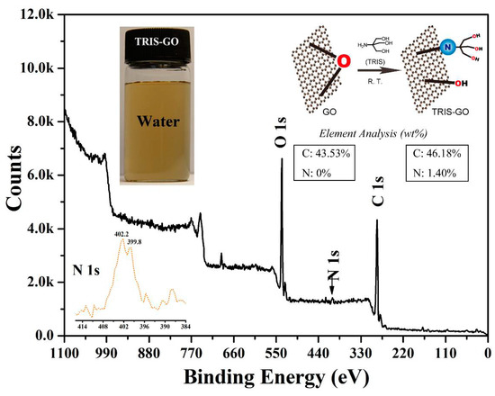 Survey X-ray photoelectron spectroscopy (XPS) data for GO-TRIS and photograph of well-dispersed GO-TRIS solution in water (inset).