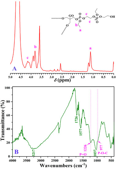 1H NMR (A) and Fourier transform infrared (FT-IR) (B) spectra of GO-TRIS-PEEP.