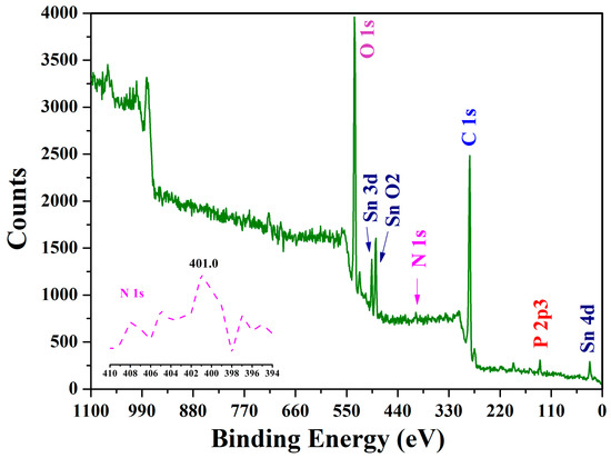 To further understand the effective functionalization of PEEP chains on GO sheets, XPS measurement was employed to provide qualitative analysis. GO-TRIS-PEEP shows a strong peak of C1s at a binding energy around 285 eV, a weak peak of N1s at around 401.0 eV and a peak at around 533 eV originating from O1s (Figure 3). Furthermore, a peak at around 134 eV is assigned to P2p3, which is resulted from PEEP chains. As the coordination between Sn of the catalyst and hydroxyls in the polymer chains [44], we also can observe the peaks of Sn4d around 24 eV, SnO2 around 487 eV and Sn3d around 497 eV. The molar contents of C, O, N and P are 65.66%, 30.44%, 0.98% and 1.89%, respectively. The weight percentage of grafted PEEP in GO-TRIS-PEEP is estimated to be 21.5 wt % from Equation (1).