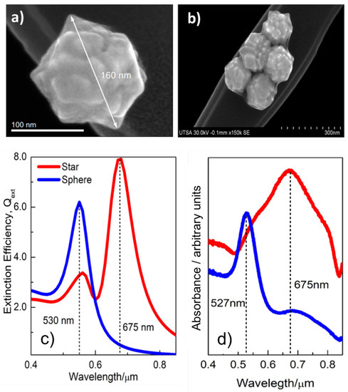 - Rodríguez-Lorenzo, L.; Álvarez Puebla, R.A.; de Abajo, F.J.G.; Liz-Marzán, L.M. Surface Enhanced Raman Scattering Using Star-Shaped Gold Colloidal Nanoparticles. J. Phys. Chem. C 2010, 114, 7336–7340. [Google Scholar] [CrossRef]