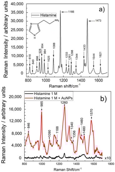 (a) Raman spectrum of powder histamine after baseline correction using Vancouver algorithm, where the modes observed correspond with the work reported by Collado et al. [42]. (b) Raman spectra of histamine 1 M with (red) and without AuNPs (black).