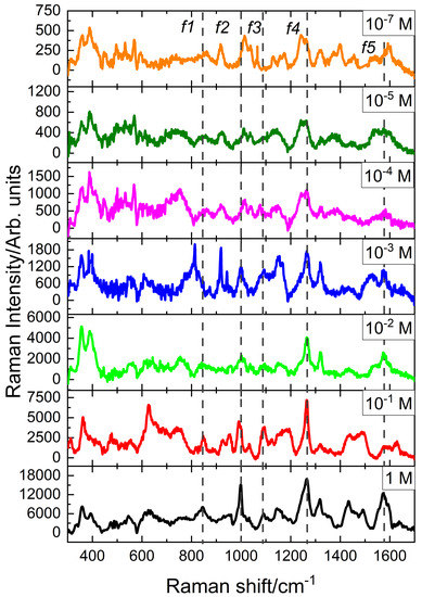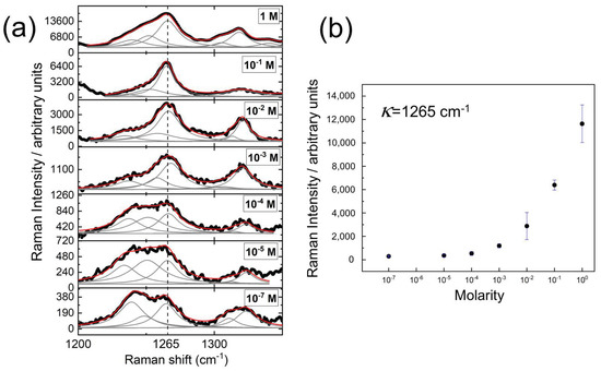 After performing SERS on different solutions of histamine dihydrochloride, it is observed that the addition of the gold nanostructures increases the intensity of the Raman spectrum (see Figure 3b). This is due to the surface plasmon resonance at the nanostars that produces larger enhancement of the electric fields that subsequently amplify the emitted light from irregular points (gaps, sharp edges, etc.) [1]. Figure 4 shows the Raman spectra for several concentrations of histamine, from 1 M to 10 M. A lower concentration means weaker signal. However, the characteristic peaks of the histamine spectrum are revealed allowing its identification. To prove this result, we have made an analysis of the resonance around (see Figure 5). This Raman shift is representative of the histamine spectra. Around this wavenumber, the phonon modes in the collected Raman spectra were decomposed into Lorentzian lineshapes. Raman spectra were analyzed by first removing the background contribution using a linear function, then, the Lorentzian curves profiles have been used for the fitting procedure of the experimental Raman spectra. This fitting applies a Levenberg–Marquardt least-squares-based iterative algorithm to optimize the parameters of the Lorentzian functions (center, height, and FWHM). These obtained spectra and Lorentzian components are shown in Figure 5a, and the importance of the Lorentzian component centered at cm is presented in Figure 5 as a function of the molarity of the sample. We may see how the Lorentzian at cm remains relevant at every concentration, revealing the presence of histamine in the sample.