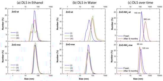 Dynamic light scattering (DLS) measurements in number % of pristine ZnO NCs obtained via traditional synthesis (ZnO-st, top panel) and via microwave route (ZnO-mw, bottom panel) in (a) ethanol; (b) water; (c) of functionalized ZnO particles (ZnO-NH2-mw and ZnO-NH2-st) in ethanol just after the functionalization procedure (solid line) and after nine months of storage (dashed line).