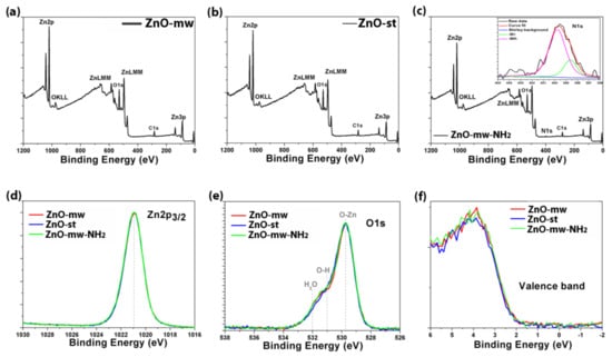 X-ray photoelectron spectroscopy (XPS) analysis: survey scans of (a) microwave-assisted synthesized ZnO nanocrystals (ZnO-mw NCs), (b) conventionally-synthesized NCs (ZnO-st NCs), and (c) amino-propyl functionalized NCs prepared by microwave assisted synthesis (ZnO-mw-NH2 NCs). Inset of Figure 6c reports the high-resolution spectra of the N1s region of the ZnO-mw-NH2 NCs. High-resolution (HR) curves comparing the three samples (ZnO-mw NCs in red, ZnO-st NCs in blue, ZnO-mw-NH2 NCs in green) for (d) Zn2p3/2 and (e) O1s regions. (f) Valence band (VB) signal related to the three samples.