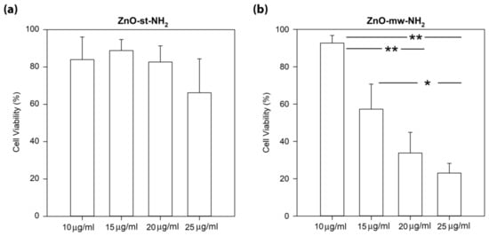 Comparison of the cell viability values of the (a) ZnO-st-NH2 NCs and (b) ZnO-mw-NH2 NCs at different concentrations toward KB cancer cell lines, detected by the WST-1 assay method. Cells were exposed in cell culture medium with different concentrations for 24 h. Results are expressed as the percent of cells viability compared to the control. The data are presented as the mean ± standard error (SE). ** p ≤ 0.001; * p = 0.05.