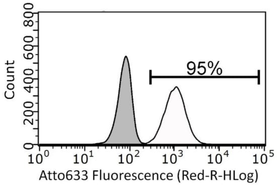 Representative flow cytometry curves of stained Atto 633 ZnO-mw-NH2 NCs uptake in KB cells. Grey area represents the untreated cells signal while the white one was obtained by cells incubated with 10 µg/mL ZnO-mw-NH2 stained with Atto633 for 24 h. Quantification of positively stained events, characterized by a shift in fluorescence intensity compared to untreated cells, was calculated setting a positive threshold beyond the grey area. Each condition is done in triplicate.