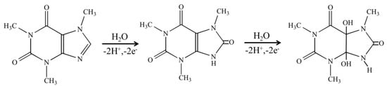 By using DPV, it is possible to further improve the sensitivity and the limit of detection. Figure 8A illustrates the DPV obtained at different concentrations of caffeine from 20 to 500 µM. The plot of the peak current vs. caffeine concentration (Figure 8B) exhibits a linear response from 20 µM to 0.25 mM with a regression equation expressed as Ip (µA) = 0.138 [] (µM) + 0.032 (R2 = 0.995). The calculated detection limit LoD using the standard addition method was 0.032 µM []. The performance of Nafion/GNPs LbL film modified electrodes using cyclic voltammetry shows high linear ranges (Figure 7D), even though they are not the best detection limits when compared to other systems reported in literature (Table 2). Nonetheless, it is useful to emphasize that the aim of this work is the detection of caffeine in commercial drinks without dilution of the sample, where, typically, the concentration of caffeine is higher than 0.1 mM. The electrochemical oxidation mechanism of the caffeine is shown in Scheme 2. The electrochemical reaction of oxidation involves four electrons and four protons. The first step of the reaction is a two-electrons and two-proton oxidation of the C–8–N–9 bond giving the substituted uric acid. Then an immediate two-electron and two-proton oxidation of the 4,5-diol analogue of uric acid occurs, which rapidly fragmented [,].