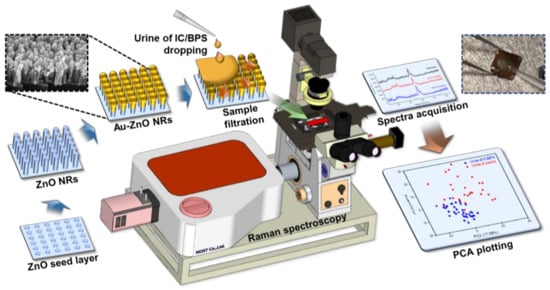 Compared to standard Raman spectroscopy, SERS enables an early detection by exhibiting a signal enhancement of 8–10 orders of magnitude, which is formed at the nanometer gap between Au/ZnO nanorods [22,23]; therefore, selecting and targeting nanometer-sized biomarkers is key to applying SERS technology for an early diagnosis. If we develop a technique to detect nano-level biomarkers of inflammatory diseases in urine or other fluids, a noninvasive diagnosis can be realized, preventing pain and discomfort for the patient. As shown in Figure 1, in this paper, we manufactured a ZnO-based nanorod analysis chip to acquire Raman signals from the obtained urine in the IC/BPS pre-clinical animal model. Raman signals and statistical analyses obtained from nano-sized biomarkers of intractable inflammatory diseases that cause pain in patients demonstrate the possibility of an early diagnosis.
