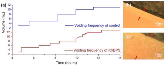 To confirm the implementation of interstitial cystitis, the voiding pattern after a week for the control group and HCl treated rats was measured. As shown in Figure 2a, an irregular voiding frequency is observed in the HCl-treated rats, which indicates the urinary dysfunction caused by bladder inflammation, and matches that of a previous animal model experiment [17,26]. In the graph, one step and a terrace represent the volume increase and the duration between voiding, respectively. The total amount of the control group and the IC/BPS animal model for about 10 h is 11 and 13 mL, while the frequency is 4 and 11 times, respectively.