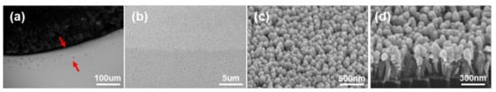 In the SERS substrate deposition, the nanorods grown after the ZnO seed deposition were 30–50 nm in diameter and 500–600 nm in length. The image of gold deposited on the nanorod structure with a thickness of 100 nm is shown in Figure 3d. The deposited gold forms clusters at the ends of the ZnO nanorods, and these clusters have diameters in the range of 80 to 100 nanometers. A finite element method (FEM) analysis of the thickness and length of the ZnO rod and the diameter of the head was conducted in a previous study [12], and it was confirmed from the FEM results that the local surface plasmon resonance (LSPR) is formed on the side of the rod and on the head. The electric field formation of the incident electromagnetic waves is formed in a direction perpendicular to the traveling direction, which constitutes the same result as the expectation that the surface enhancement between gold-coated nanorods can occur well. Thus, the Raman signal obtained in the urine-diffused region becomes an enhanced signal of the biomarkers located within the nano-sized pores of the SERS substrate.