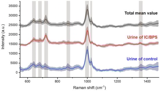 Averaged Raman spectra for all samples (black line), for IC/BPS (blue line), and control (red line) of rat’s urine. Standard deviations are painted around the spectra, and the main peaks marked by bands are due to nanometer-scale bio-markers.
