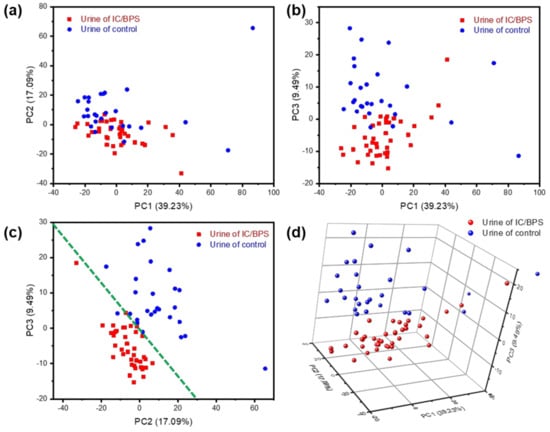 Principal component analysis results for urine of IC/BPS and control sample: (a) PC1 (39.23%) vs. PC2 (17.09%); (b) PC1 vs. PC3 (9.49%); (c) PC2 vs. PC3; (d) 3D plot of PC1, PC2, and PC3.