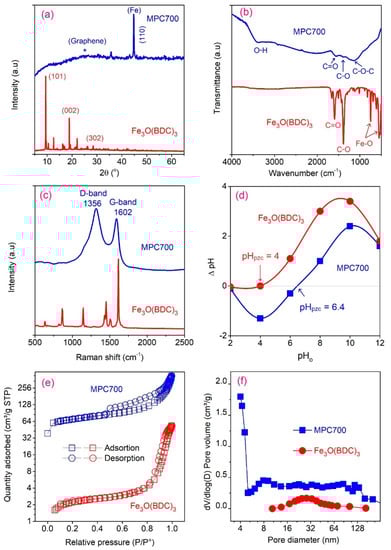 The XRD (a), FTIR (b), Raman (c), pHpzc (d), nitrogen adsorption/desorption (e), and pore size distribution (f) of Fe3O(BDC)3 and MPC700.