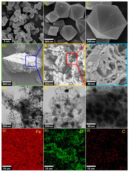 The morphological properties of the Fe3O(BDC)3 and MPC700 can be analyzed by the SEM, and TEM as shown in Figure 3. Overall, there was a morphologically noticeable difference between Fe3O(BDC)3 precursor and MPC700. In detail, the Fe3O(BDC)3 crystals in Figure 3a–c are likely to adhere to a perfect hexagonal structure at scale 500 nm, while the MPC700 obtained the relatively defective, amorphous, and heterogeneous structure as seen from Figure 3d–f. To better understand of structure of MPC700, TEM images in Figure 3g–i reveal a great dispersion of dark sites, which may be attributable to the aggregation of magnetic Fe particles and encapsulated by opaque regions (mesoporous carbon). In addition, the EDS elemental mapping in Figure 3j–l implies that structure of MPC700 was constructed by iron, carbon and oxygen elements [40].