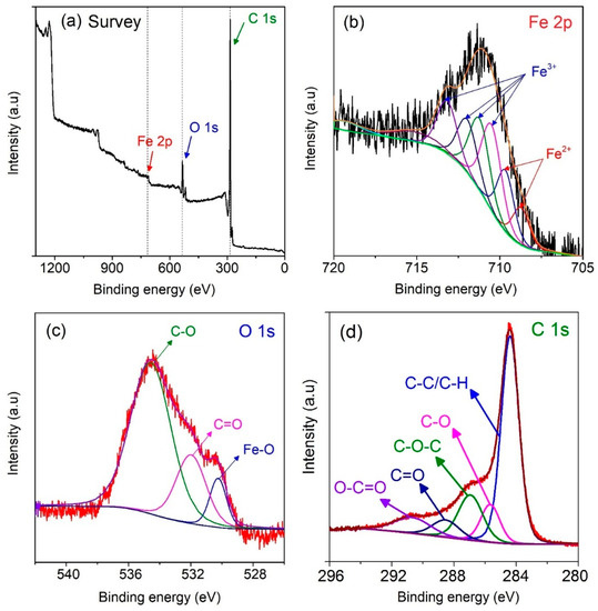 To gain the insight into the existence of chemical bonds in MPC700 nanocomposite, the XPS technique was further studied, and depicted in Figure 4. As observed from Figure 4a, the preliminary survey results indicate that MPC700 was solely constituted of three elements: iron (Fe 2p), carbon (C 1s) and oxygen (O 1s). For details, the Figure 4b shows the broad photoelectronic peak of Fe 2p3/2 sub level at around 710.8 eV. This level can be converted into various signals of Fe3+ species at 710.6, 711.3, 712.1, 713.3 eV, and Fe2+ species at 709.7, 708.8 eV, suggesting that the composite may contain both Fe2+ and Fe3+ species (FeO, Fe3O4, Fe2O3, FeOOH) without detecting any trace of ZVI [41,42,43]. However, according to the XRD and FT-IR spectra, there was the only diagnostic peak of ZVI found in the structure of MPC700. Hence, it is possible that Fe2+ and Fe3+ species encapsulate the outside shell of ZVI particles, leading to no detection of ZVI signals in the XPS spectrum of MPC700 composite because of its sensibility at limited range of depth (<10 nm) [44]. This observation also supported again the fact of the partial reduction of Fe-O bonds by carbon during the pyrolysis. Moreover, The O 1s XPS spectrum in Figure 3c exhibits three peaks at binding energies 534.6, 533.0, 530.0 eV, corresponding to chemisorbed O, C-O/C=O, and iron oxides Fe-O, while the C 1s XPS spectrum in Figure 3d indicates the presence of chemical bonds consisting of O-C=O (290.6 eV), C=O (288.5 eV), C-O-C (286.9 eV), C-O (285.7 eV), C-C/C-H (284.4 eV) [45]. These chemical bonds along with respective energies from the fitting of C 1s is very much in line with recent work [46].