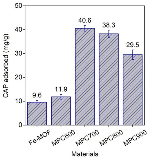 The pyrolysis temperature makes a vital contribution to the formation of the structure and novel properties of materials MPCs. Herein, we investigated the effect of calcination temperature from 600 °C to 900 °C on adsorption capacity, aimed at discovering the optimal temperature for CAP adsorption. The experiments were carried out under standard conditions, but the pH values of initial CAP concentrations were unadjusted. Figure 5 illustrated the CAP adsorbed on the Fe3O(BDC)3 and MPCs-x. It is evident that CAP adsorption capacity of MPCs-x was noticeably higher than that of Fe3O(BDC)3, and MPC700 obtained the best adsorption capacity, at 40.6 mg/g, compared with 9.6 mg/g of Fe3O(BDC)3. Therefore, the arrangement of relative adsorption capacity of materials in this study complied with the order: Fe3O(BDC)3 < MPC600 < MPC900 < MPC800 < MPC700. These results proposed that MPC700 could be a delegate of the MPC family for comparing their remediation efficiency of the selected pharmaceutical CAP with pristine Fe3O(BDC)3 in the following experiments.