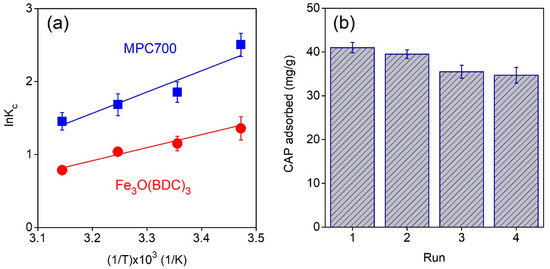 Figure 7a plots the impact of temperature (288–318 K) on CAP adsorption onto MPC700 and Fe3O(BDC)3. In addition, thermodynamic constants involving enthalpy (∆H), entropy (∆S) and Gibbs free energy (∆G) were shown in Table 7. The negative ∆H values indicate the adsorption of CAP over MPC700 and Fe3O(BDC)3 was an exothermic process, which totally agreed with a recent work [51]. Meanwhile, negative values of ∆S show a decline in disorder occurring in heterogeneous phase because of migration between solvent and CAP molecules during sorption [45]. Finally, the negative values of Gibbs free energy indicate that the adsorption of CAP onto MPC700 and Fe3O(BDC)3 was a spontaneous process.