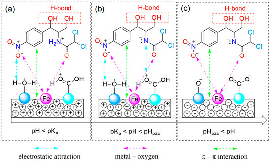 Obviously, the π-electronic rich system on mesoporous carbon of MPC700 can create a special interaction with π-electrons of aromatic rings on CAP molecules, called “π–π interaction”, while the bridge between zero-valent iron and oxygen-containing functional groups results in the type of metal-oxygen interaction, as observed in Figure 8a–c. Otherwise, the electrostatic attraction can be divided into three circumstance.