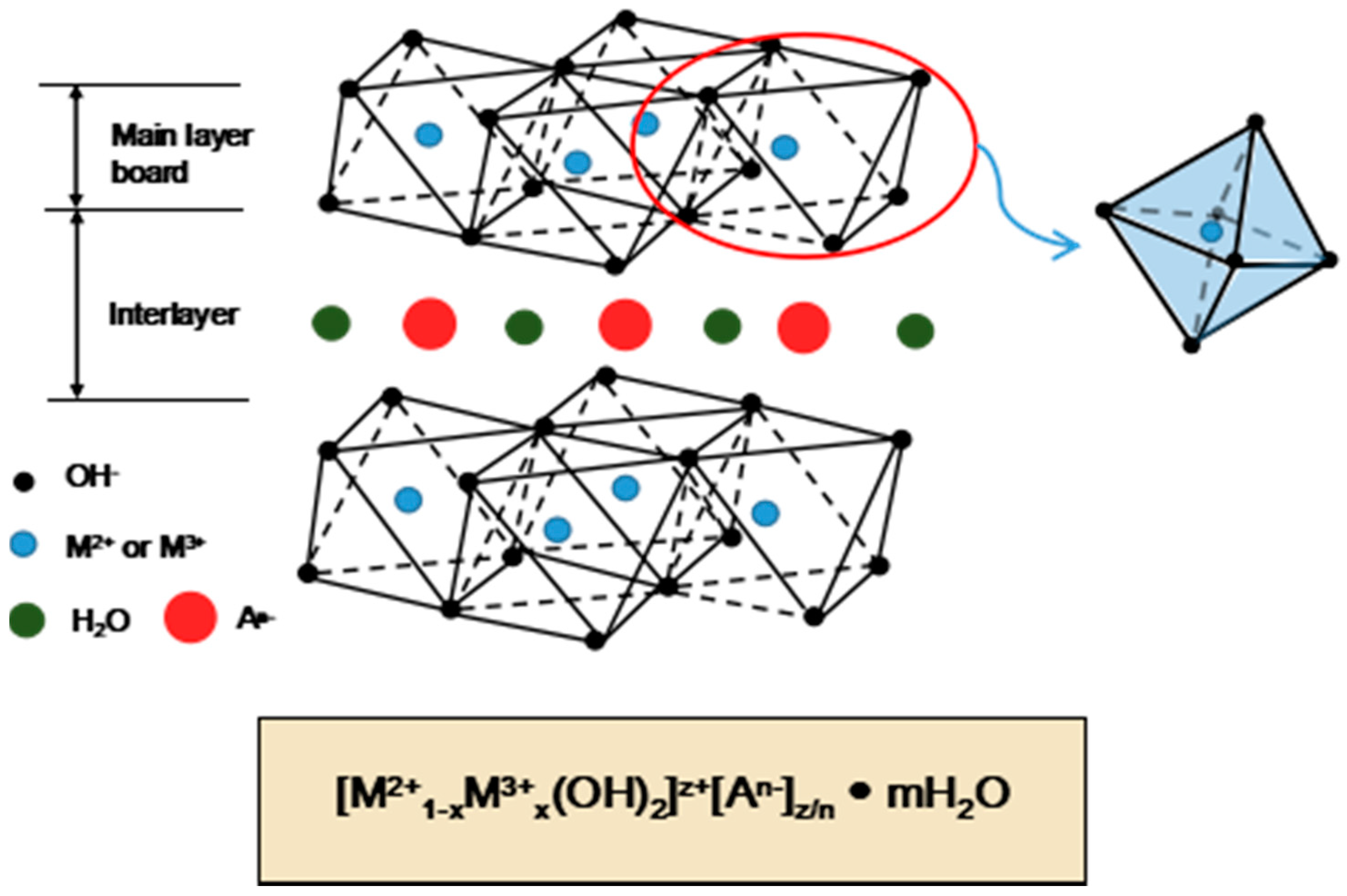 - Rives, V. Layered Double Hydroxides: Present and Future; Nova Science Pub Inc.: New York, NY, USA, 2002; pp. 75–76. [Google Scholar]