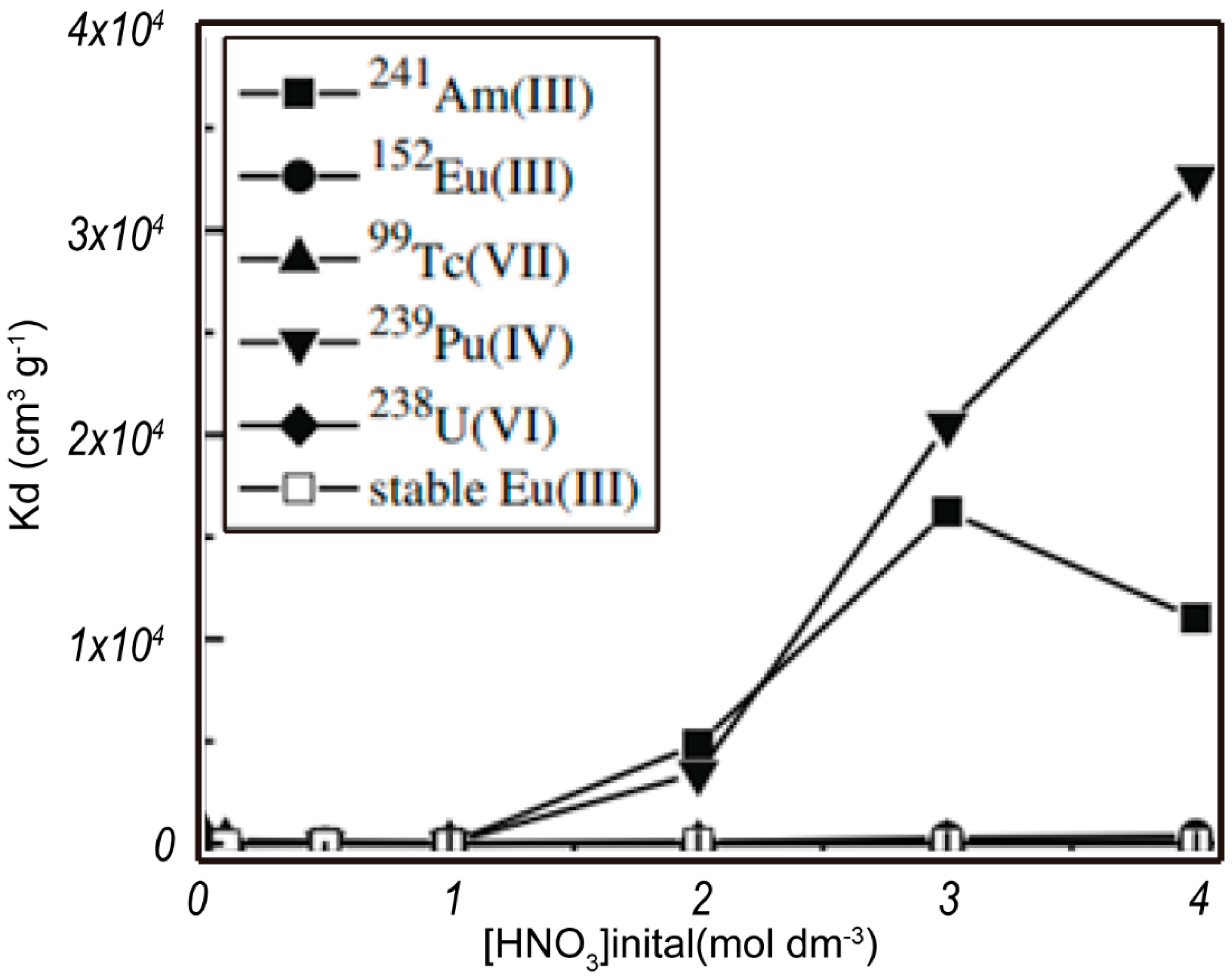 3.3. Adsorption of Minor Actinides on Silica/Polymer-Based CA-BTP Adsorbent