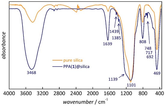 The formation of covalent bonds between the silica phases and the respective guest molecules was investigated by FT-IR spectroscopy and by solid-state MAS-NMR spectroscopy. Figure 1 shows example IR spectra of pure silica (monolith) and of the respective PPA(1)-functionalized sample. Characteristic absorption bands of amorphous silica appear at 3450 cm−1 (s, Si–OH and H2O), 1640 cm−1 (w, Si–OH and H2O), 1180 cm−1 (s, Si–O–Si), 800 cm−1 (m, Si–OH), and 460 cm−1 (m, Si–O–Si) [34]. The functionalized sample exhibits additional signals at ca. 750 cm−1, assignable to the P–C stretching vibration, as well as at 1439, 1385, 717, and 692 cm−1, assignable to aromatic ring vibrations [21,35,36]. This confirms the presence of the guest species, but not necessarily its covalent bonding to the silica surface. Similar results were obtained for the other samples. 29Si MAS-NMR spectra (shown in Supplementary Materials, Figure S4) exhibit weakly resolved Q4 signals with varying fractions of Q3 signals. Due to their low resolution, the 29Si NMR spectra did not provide conclusive information on the presence of covalent bonds between the silica surface and the guest molecules. Hence, 29Si NMR was not further pursued in this study.