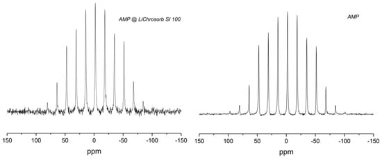 Figure 2 shows an example 31P MAS-NMR spectrum of mesoporous silica (monolith) functionalized with the biomolecule AMP (2) in comparison with the spectrum of pure AMP. For these samples, as well as the other silicas loaded with AMP (cf. Supplementary Materials, Figure S5), a broad pattern of rotational side bands was observed. The large chemical shift anisotropy indicates that the AMP molecules were immobile. Some of the samples show an additional narrow peak, forming a downfield shoulder of the center band and accounting for at most a few percent of the total spectral intensity. For these peaks, no spinning side bands can be recognized; they may result from a small fraction of mobile AMP molecules or a by-product of the reaction. In order to assign the central peak of the side-band pattern, several measurements at different spinning frequencies were performed; an isotropic chemical shift of −2.0 ppm was determined for all AMP-containing samples. The Herzfeld–Berger analysis [31,32] of the side-band intensities yielded the principal values of the chemical shift tensors, which were 69.2, −1.6, and −73.7 ppm for AMP@LiChrosorb SI 100 and 71.9, −1.8, and −76.1 for neat AMP. The spectral parameters of these two and the other AMP samples are too similar to support the hypothesis of a chemical binding of AMP to the silica surface.