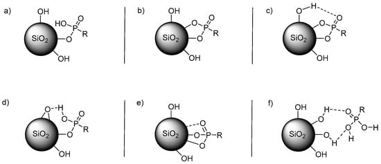 Possible types of attachment of a phosphonic acid to SiO2: (a) monoester; (b) diester; (c) diester with hydrogen bonding to a silanol group; (d) monoester with hydrogen bonding to a surface oxygen atom; (e) diester with Lewis acid/base interaction with a silicon atom; (f) pure hydrogen bond interactions.