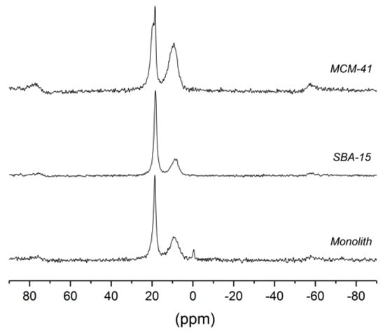 31P CP-MAS-NMR spectra of MCM-41, SBA-15, and a monolith functionalized with phenylphosphonic acid (PPA, 1). The spectra were measured at a spinning frequency of 8 kHz and exhibit spinning sidebands near 80 and −60 ppm.