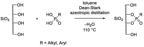 General Functionalization: Silica (300 mg), phosphonic/phosphoric compound (0.1 equiv.), and absolute toluene (40 mL) were refluxed under N2 in a Dean–Stark apparatus for 16 h. Thereafter, the toluene was decanted from the solid. The remaining solid was washed three times with toluene, methanol, and dichloromethane. After this treatment, the solid was dried at 70 °C in a drying cabinet. The level of functionalization and spectral data for each material are presented in the Supplementary Materials.