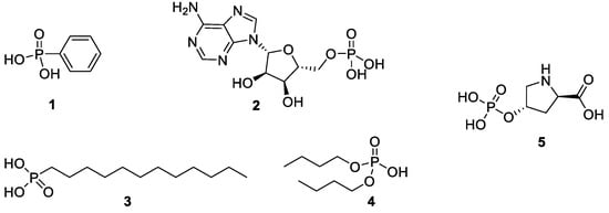 To evaluate different phosphonic acid and phosphoric acid ester analogs with alkyl and aryl substituents, phenylphosphonic acid (PPA, 1 in Scheme 2), the biomolecule adenosine monophosphate (AMP, 2), n-dodecylphosphonic acid (DPA, 3), and di-n-butyl phosphate (DBP, 4) were chosen. Also, (4R)-4-phosphonooxy-l-proline (5) [29] was used for a catalytic application.