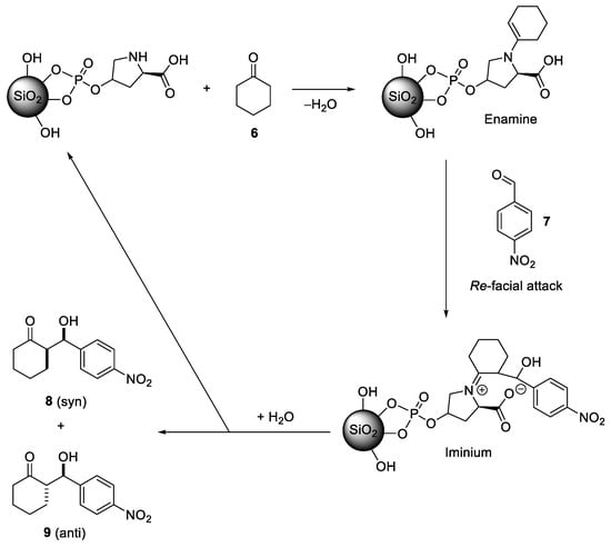 For the reaction, 20 mol.% of the functionalized material, 20 equivalents of cyclohexanone and one equivalent of p-nitrobenzaldehyde were applied. The spectral data for the obtained two diastereomeres (anti and syn) were consistent with literature values [40,41,42]. The reaction with the pure catalyst (5) in solution resulted in a good yield and high selectivities. Slightly lower yields were obtained for the two heterogenic systems of (5) immobilized in LiChrosorb SI 100 silica or in SBA-15 silica, respectively (Table 5). The latter resulted in the lowest yield, consistent with its lower degree of loading as compared to the LiChrosorb system. Most remarkably, the immobilization of the organocatalyst does not have any negative effect on the diastereoselectivity (dr) or enantioselectivity (ee), which is often a problem when chiral catalysts are immobilized. A possible mechanism of the catalyzed reaction is shown in Scheme 4, in analogy to the homogeneous systems [43].