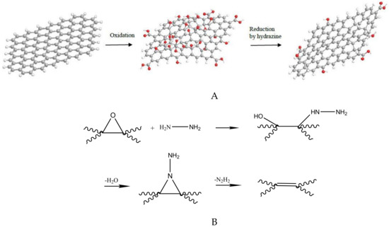 Sketch of the experimental process followed for oxidation (A) and posterior epoxy reduction (using hydrazine) (B) of graphene nanosheets [the process is described in detail in [15]].