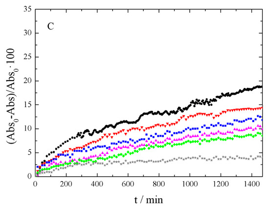 Absorbance decrease, 100 (Abs0 - Abs)/Abs0, at λ = 250 nm and different sonication time (● 1 h, ▼2 h, ■3 h, ▲4 h, ♦5 h, and ★6 h) of (A) xGnP/PG, (B) xGOnP/PG and (C) r-xGOnP/PG nanofluids, 0.003 wt%, T = 298.15 K.