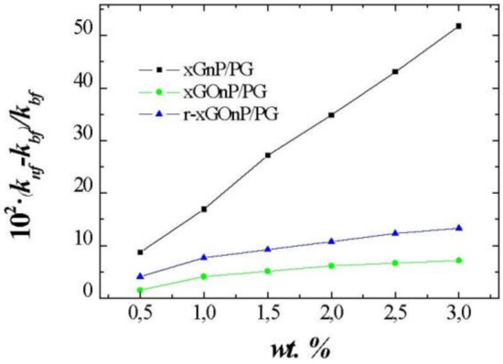 These differences are because, after the oxidation part of the properties of the xGnP nanoparticles are lost, the thermal conductivity of xGOnP nanoparticles decreases drastically. After a reduction of xGOnP nanoparticles, part of these properties are recovered. Therefore, thermal conductivity of the r-xGOnP/PG nanofluids increases compared to xGOnP/PG nanofluids.