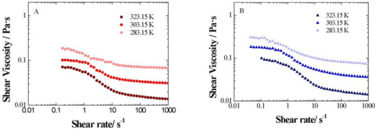 The influence of temperature on the flow curves was additionally studied for xGnP/PG nanofluids at different weight fractions between 283.15 and 323.15 K, as shown in Figure 9, where the expected viscosity decrease with an increasing temperature is observed.