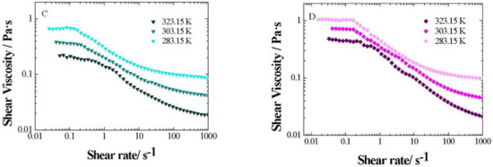 Shear viscosity change with shear rate (γ) for xGnP/PG nanofluids at different weight fractions: (A) 0.5 wt%, (B) 1 wt. %, (C) 2 wt. % and (D) 3 wt. %, between 283.15 and 323.15 K.