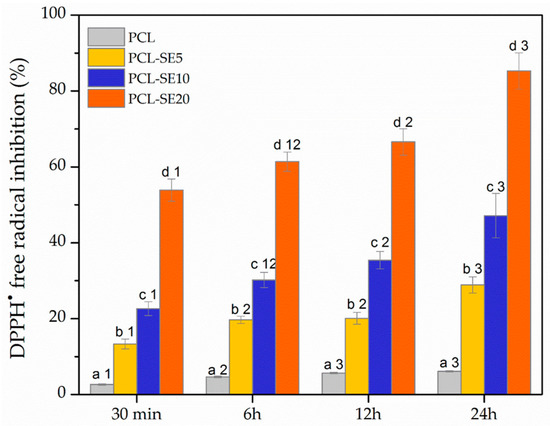 | PCL-SE10 | no viable counts | biocidal effect | 6.18 ± 0.16 | 0.91 |