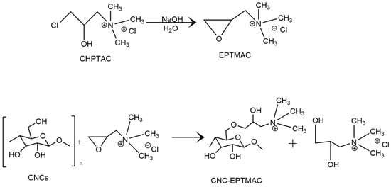 CNC etherification was achieved via alkaline hydrolysis. A basic medium was required for the activation of the hydroxyl groups as well as for cleavage of the sulfate half-ester groups in order to ensure the pure cationic nature, at the same time CHPTAC formed the reactive epoxy functional group EPTMAC [22]. As a result, a nucleophilic reaction between the alkali group (-OH) of the CNCs and the EPTMAC epoxy group occurred, yielding CNC-EPTMAC (Figure 1).