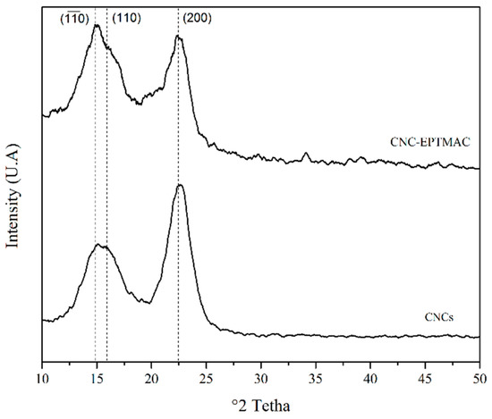 The crystalline properties of unmodified CNCs and CNC-EPTMAC were analyzed by XRD (Figure 4). The typical peaks of Iβ cellulose located on the 2ϴ angle, were observed at 15.3° and 16.5° and were assigned to the planes (110) and (110), which are clearly solved for CNCs. The peak of the plane (200) was located at 22.6 ° and corresponded to the main crystalline region of cellulose I [35]. A Relative crystallinity index (RCI) of 83.6% was calculated for unmodified CNC, while an RCI of 74.7% was obtained after EPMAC-grafting. The decrease in RCI was due to the modification and suggests that another carbon, aside from C6, had been modified. However, the characteristic peaks of Iβ cellulose were maintained. The modification led to no significant changes in the signals of the CNCs; it can therefore be concluded that neither the exposure time to nor the molar ratio of the cationic agent changed the crystal structure of the CNCs, indicating that the modification takes place on the surface only.