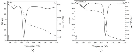 Degradation of CNCs was observed in TGA outputs, and usually occurred in two steps (Figure 5a). The first step involved the removal of surface sulfate half ester groups; this began at a temperature of 150 °C, with an 8.41% loss of mass. Then, the cellulose was degraded in the temperature range of 250–450 °C, with a total mass loss of 42.46–61.63%. The 4.53% degradation at 100 °C was assigned to the loss of humidity, within the 2–5% range reported by others for CNCs at 100 °C [36,37]. The loss of sulfate groups at 150 °C, with a mass loss between 5-8% and degradation of cellulose between 250–500 °C, agreed with the experimental data. The CNCs modified with the cationic agent displayed variations in thermal properties (Figure 5b). Moreover, the CNC-EPTMAC thermogram showed a water loss of 7.05% at 100 °C, and two states of mass loss, the first taking place at 178 °C, with a mass loss of 13.57%, arising from the thermal decomposition of the quaternary ammonium groups grafted onto the surface of CNCs, and the second, beginning at 320 °C, with a mass loss of 61.56%, arising from the primary decomposition of the carbon skeleton [38].