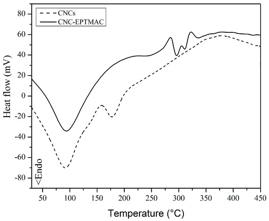 DSC analysis revealed two peaks (100 °C and 170 °C) for CNC (Figure 6). The first one corresponds to intramolecular humidity, while the second one suggests different decomposition mechanisms, possibly direct transitions from the solid to gas phase, catalyzed by surface sulfate groups. It has been reported that the activation energies of CNC degradation are significantly reduced upon the introduction of sulfate groups via hydrolysis with sulfuric acid [39]. Indeed, the thermal stability of the CNCs was compromised by the sulfate groups, while CNC-EPTMAC showed fusion endotherms at 100 °C, corresponding to intramolecular water molecules of humidity of the crystalline structure, and two more endotherms at 300 °C and 320 °C, corresponding to a cationic graft.