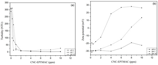 The stability of the pH of the aqueous medium is one of the most important factors of water treatment and can reduce the costs of pre-treatment pH adjustments [34]. In a colloidal system that includes the suspension medium and CNC-EPTMAC particles, features like agglomeration, dispersion and suspension stability may be influenced by external factors such as the flux of hydrogen ions (H+) in solution. Measurement of the Zeta potential of 0.1 wt.% CNC-EPTMAC suspensions over a wide range of pHs indicated that a pH range between 2 and 10 did not have a pronounced effect on the Zeta potential of the CNC-EPTMAC flocculant and did not decrease below 20 mV (Figure 2).