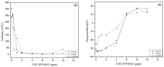 DS, i.e., the molar ratio of CNC-EPTMAC, is another key variable impacting the flocculation capacity. At a molar ratio of 12 mol of CHPTAC per AGU, less flocculant was required to remove a greater proportion of the turbidity of the SiO2 suspension, while the required concentration of flocculant increased as the molar ratios declined (Figure 9a). Likewise, Figure 9b shows that surface charge neutralization was achieved in the presence of a lower concentration of CNC-EPTMAC prepared with a molar ratio of 12 mol of CHPTAC per AGU as compared to CNC-EPTMAC prepared at a lower molar ratio, to achieve the optimal dose for the neutralization of the colloidal suspension of SiO2. This is due to the fact that the greater the molar ratio, the greater the DS, and therefore, there is a greater number of exposed cationic groups on the modification surface of the CNCs which can interact with the colloidal particles.