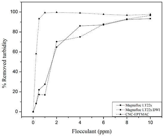 Finally, a comparison of the effectiveness CNC-EPTMAC versus commercial flocculants with high cationic content and Zeta potential close to that of CNC-EPTMAC (Figure 10), showed that CNC-EPTMAC provided a greater turbidity reduction (99.7%) and had a lower optimal dose than commercial flocculants. This may be attributed to the fact that despite the equivalent Zeta potentials, the CNC-EPTMAC, due to its nanometric scale, has a greater surface area of contact with the particles in suspension.