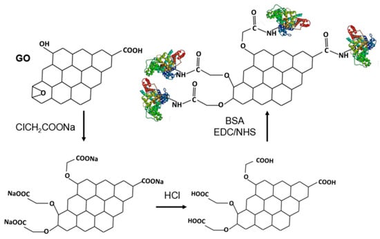 To increase the efficiency of the conjugation between GO and BSA, we increased the content of the carboxyl group on the GO surface according to a previous work [35]. The oxygen-containing functional groups such as epoxy, ester, and hydroxyl on the surface of GO were effectively converted to –COOH by adding ClCH2COONa under alkaline conditions, as shown in Figure 2. It was reported that the –NH2 contained in His, Arg, and Lys groups as well as the N-terminal of BSA can bind to –COOH of GO–COOH in the presence of EDC/NHS [41].