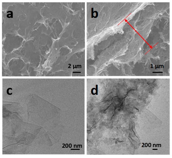 Morphological analysis of GO–BSA membranes: (a) SEM image of surface morphology of the GO–BSA film. (b) SEM image of the cross-section of the GO–BSA. (c) TEM image of surface morphology of the GO. (d) TEM image of surface morphology of the GO–BSA.