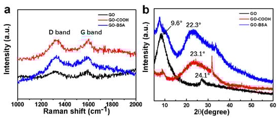 The Raman spectrum was further used to characterize the change of the functional groups before and after the GO hybridization with BSA, as shown in Figure 4a. The Raman spectrums were measured by using a laser source with the center wavelength of 780 nm. Two peaks at 1315 cm−1 and 1585 cm−1 can be assigned to the D and G bands, respectively. The D band is related to the vibrations of sp3 carbon atoms of disordered GO nanosheets, and the G band corresponded to the vibrations of sp2 carbon atom domains of graphite. The GO–COOH Raman spectra exhibited that there was enhanced D peak at 1380 cm−1 (Figure 4a) and G-peak at 1576 cm−1 (Figure 4a), as well as no 2D peak at 2700 cm−1 (not shown) in the Raman spectrum, indicating that all GO nanosheets were functionalized as GO–COOH [42]. Furthermore, the intensity ratio between D and G bands (ID/IG) of GO was 0.95 and further increased to 1.01 for GO–COOH. This trend indicated the presence of disordered structures and defect sites on GO–COOH sheets, most likely resulting from the carboxylation of GO [43]. After the combination with BSA, the peak of the D at 1315 cm−1 and the G at 1585 cm−1 decreased compared with GO–COOH. The ID/IG increased from 1.01 to 1.11, indicating the defect density increases as a result of exfoliation and chemical modification [44,45]. Therefore, we suggested that BSA could not only be inserted into the GO nanosheets but can also interconnect GO monolayers together to form condensed GO–BSA hybrid membranes.